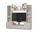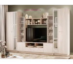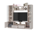 Центральную секцию гостиной Зарина можно дополнить платяным шкафом с зеркалом. Стенка с витриной для гостиной Зарина выполнена в классическом стиле в светлом оттенке дерева. Гостиная шириной 2 метра с нишей для телевизора, двумя выдвижными ящиками, открытыми и закрытыми полками и с двумя шкафами со стеклом по бокам.