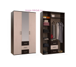 - Шкаф трехстворчатый для одежды имеет 3 ящика, зеркальную дверь. Шкаф оснащен металлической перекладиной и полками для одежды.