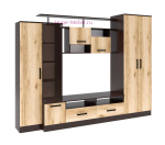 Стенка в гостиную Оскар-5 длиной чуть меньше 2 метров представляет из себя вместительную систему хранения с платяным шкафом, витриной для посуды и тумбой для ТВ. Гостиная выпускается фабрикой в нескольких современных цветовых решениях., в том числе в сочетании темного корпуса венге с фасадами дуб делано.