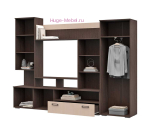 Недорогая стенка в гостиную с лаконичным современным дизайном и контрастной отделкой с фактурой дерева. Гостиная с платяным шкафом с выдвижной штангой и закрытым шкафом для книг или посуды.