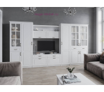 Комплект мебели для гостиной Апполия белого цвета с фасадами МДФ с фрезеровкой. Общая ширина комплекта 390 см, почти 4 метра. Стенка в гостиную Апполия модульная, что означает что её можно купить частично и что все предметы можно расположить в удобном для вас порядке. Модули укомплектованы декоративным карнизом, можно купить гостиную без него.