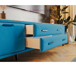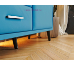 ТВ тумба 1.6 метра с тканевой обивкой из велюра голубого цвета и столешницей из МДФ в цвете дуб канадский. Тумба с двумя выдвижными ящиками и двумя откидными дверцами вмещает большое количество вещей. Надежная столешница из МДФ устойчива к влаге. Стильные высокие опоры облегчают уборку.