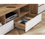 Недорогая тумба для телевизора с двумя выдвижными ящиками и открытыми полками. Выдвижные ящики на шариковых направляющих полного выдвижения. Тумбу можно дополнить настенной полкой, пеналами или шкафом.