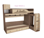 Двухъярусная детская кровать с выдвижной лестницей-шкафом и дополнительными полками и ящиками.