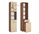 Недорогой шкаф пенал с выдвижными ящиками, открытыми и закрытыми полками. Пенал из серии мебели в детскую Орион выполнен в сдержанной цветовой гамме в сочетании с изображениями городов мира, нанесенными на фасады способом фотопечати.