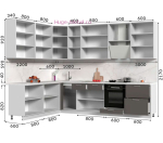 Большая угловая кухня 3 на 2.2 метра с матовыми прямыми фасадами МДФ. Кухня с высокими верхними шкафами подходит для помещений с высотой полков от 230 см. Кухонный гарнитур модульный и его размеры и комплектацию можно изменить.