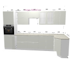- В стоимость угловой кухни входят шкафы верхние и нижние с фасадами МДФ, ручки, петли, ножки, цоколь белого цвета. Столешницы и мойка приобретаются дополнительно.