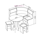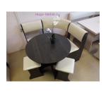 Недорогой кухонный уголок состоит из угловой скамьи, круглого стола и двух табуретов.