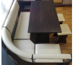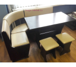Недорогой кухонный уголок продается комплектом состоящим из стола, углового кухонного дивана и двух табуретов.