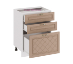 пластиковые регулируемые ножки, нижний цоколь белого цвета из ЛДСП.Кухонный шкаф нижний с тремя ящиками продаётся без столешницы, схема сборки кухонного шкафа в комплекте.Рекомендуемая мебель - популярное в нашем магазине
