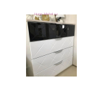 Недорогой комод белого цвета с четырьмя выдвижными ящиками на шариковых направляющих полного выдвижения. Комод с глянцевыми фасадами и вставкой из стекла чёрного цвета входит в коллекцию мебели для спальни Кимберли.