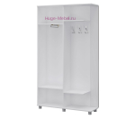 Небольшая белая прихожая со шкафом подходит для малогабаритных квартир. Прихожая включает в себя открытую вешалку с несколькими полками и крючками для одежды и шкаф с зеркалом и выдвижной штангой.
