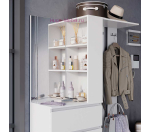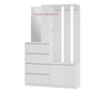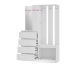 Недорогая прихожая белого цвета шириной 120 см подходит для небольших квартир. Прихожая Симпл включает все необходимое для размещения вещей, одежды и обуви: Настенная вешалка с тумбой для обуви внизу, зеркало с открытыми полками и комодом с 4 выдвижными ящиками. При желании прихожую можно дополнить шкафами Симпл для размещения гардероба.
