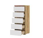 Высокий недорогой комод с 5 выдвижными ящиками на шариковых направляющих. Комод из серии мебели Хелен выпускается в двух цветах: белый и сочетание белого и дуба крафт.
