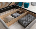 Двуспальная кровать Нега с высоким изголовьем и мягкой обивкой из светло-голубого велюра продается в комплекте с ортопедическим основанием с подъемным механизмом и ящиком для хранения белья. Надежная кровать с обивкой из качественной ткани выпускается в нескольких цветах.