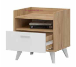 Прикроватная тумба с выдвижным ящиком и открытой полкой подходит для односпальной, полутороспальной и двуспальной кровати Ирис. Тумба устанавливается на косых опорах белого цвета высотой 12 см.