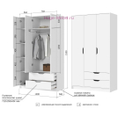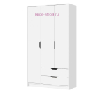 Недорогой трехстворчатый шкаф белого цвета. Шкаф шириной 120 см с двумя выдвижными ящиками, полками и штангой для одежды на плечиках. Внутри шкафа два отделения: слева отсек с полками шириной 38 см, справа над выдвижными ящиками отсек со штангой с дополнительной полкой наверху.