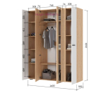 Недорогой четырехстворчатый шкаф для одежды с зеркалами. Внутри шкафа три отделения: два отсека с полками слева и справа и центральный отсек со штангой для одежды на плечиках и двумя полками. Шкаф шириной 160 см с фасадами белого цвета и корпусом под дерево. Шкаф можно дополнить другой мебелью для спальни, гостиной и прихожей из серии Санса.