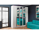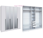 Пятистворчатый распашной шкаф шириной 2 метра с тремя зеркальными створками и тремя выдвижными ящиками внутри. Шкаф внутри разделен на три отсека: два отделения со штангами для одежды, длина каждой штанги 77 см, и отсек с 4 полками под которыми расположено 3 выдвижных ящика. Отделения со штангами для одежды на плечиках дополнительно укомплектованы двумя полками шириной 77 см. Ширина полок в центральной части шкафа 38,2 см. Ширина каждой из пяти дверей шкафа 39,6 см, двери с накладными ручками черного цвета. Шкафы Мадрид высотой 230 см может быть дополнен антресолью высотой 30 или 40 см, антресоли покупаются отдельно.