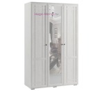 Вместительный 3-х створчатый шкаф для одежды Ричард в светлом оттенке дерева ясень анкор. Шкаф шириной 135 см с двумя отделениями внутри: отсек со штангой для одежды длиной 87 см и отделение с 4 полками шириной 42,4 см. Центральная створка с зеркалом в патинированной раме, цельное зеркало не делит отражение, сам зеркальный фасад проклеен с обратной стороны специальной плёнкой, которая удерживает осколки в случае, если створка будет случайно разбита. Боковые глухие фасады декорированы раскладками в виде объемного геометрического узора. Классический дизайн шкафа дополняют металлические ручки в цвете олово.